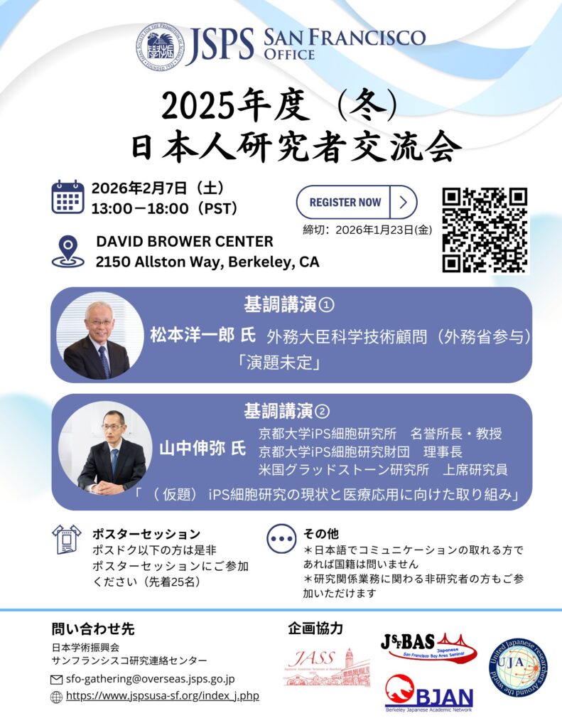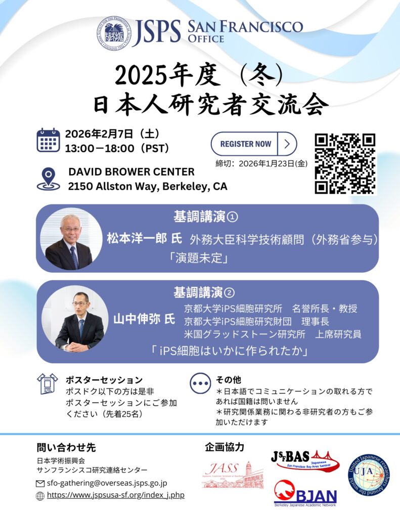 当センターでは、アメリカ大陸において活躍されている日本人研究者の方々の分野を越えた交流の促進や、情報交換等を通じて、研究活動を一層充実させていただくことを目的に、交流会を開催しております。この度、下記の日程で、当センター主催「2025年度(冬)日本人研究者交流会」を開催いたします。より多くの日本人研究者の方々にご参加いただき、刺激的で実り多い場としたいと考えておりますので、奮ってご参加いただけますと幸いです。